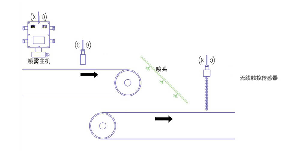 设备安装简单、方便、快捷,直接吊挂固定电控箱连接供水管及喷雾管路,无线触控传感器直接吊挂到皮带上方即可。皮带机开启,有物料经过时,触碰杆震动,无物料时,触碰杆静止,无线物联发射器检测到震动或静止信息后发射相应无线指令,控制阀门开关,实现有煤喷洒,无煤停止。